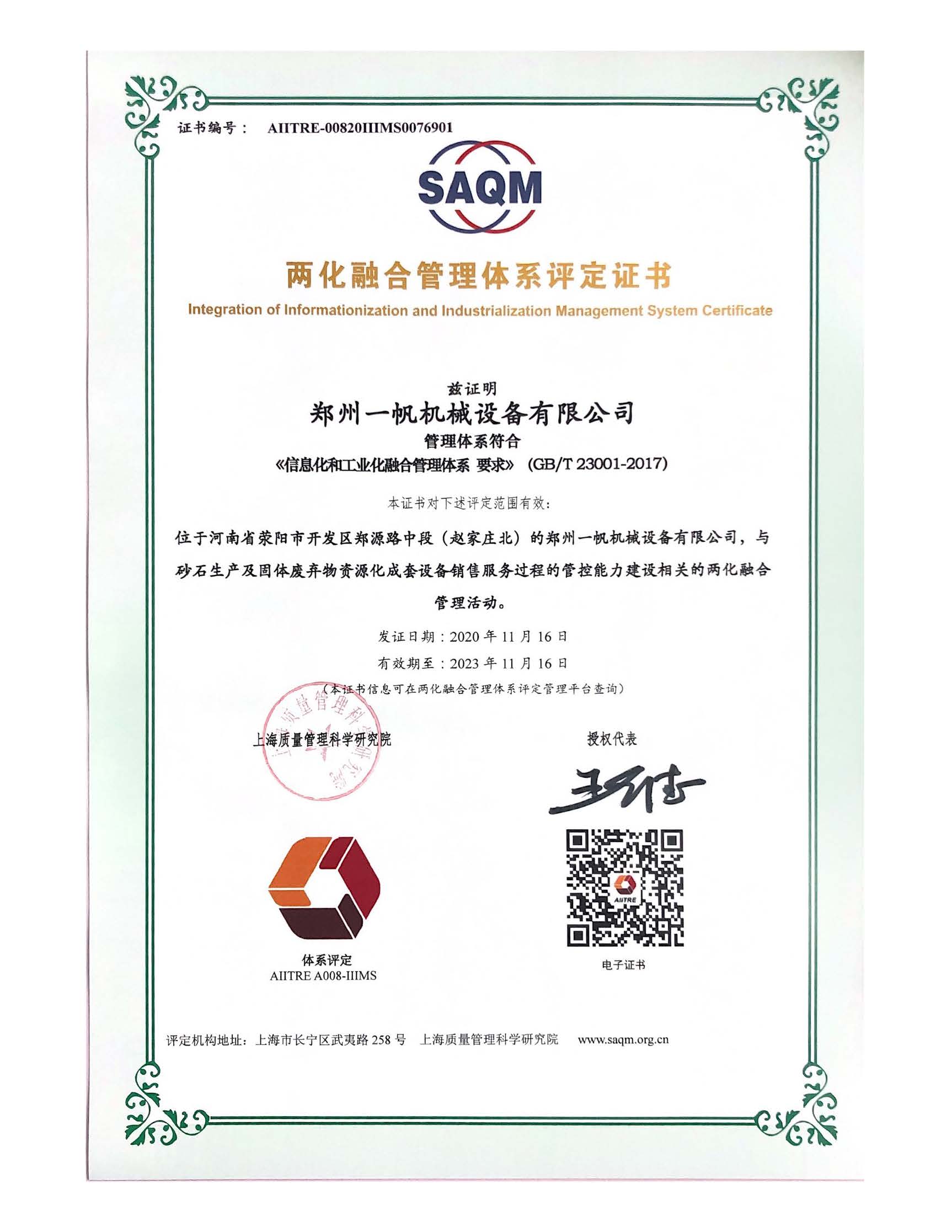 10、鄭州一帆機械獲得兩化融合管理體系評定證書。