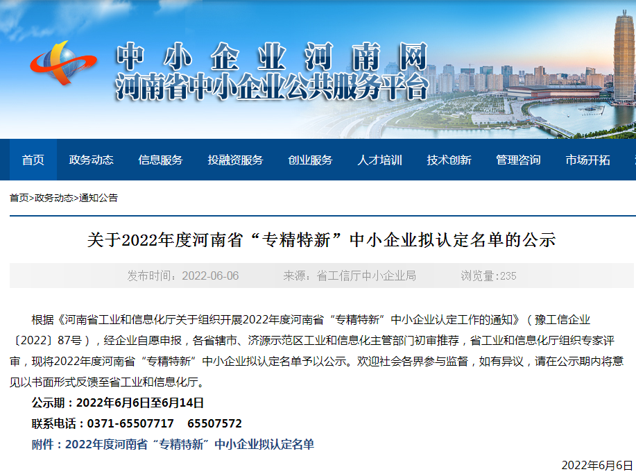 近日,河南省中小企業(yè)公共服務(wù)平臺對2022年度河南省“專精特新”中小企業(yè)擬認定名單進行公示。