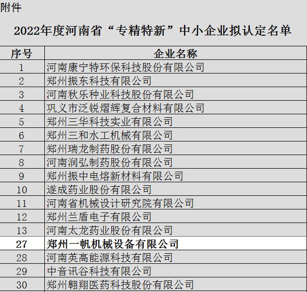 根據(jù)《河南省工業(yè)和信息化廳關(guān)于組織開展2022年度河南省“專精特新”中小企業(yè)認定工作的通知》,經(jīng)企業(yè)自愿申報,各地工業(yè)和信息化主管部門初審?fù)扑],省工業(yè)和信息化廳組織專家評審認定,鄭州一帆機械設(shè)備有限公司憑借專業(yè)的技術(shù)與研發(fā)能力成功入選2022年度河南省“專精特新”企業(yè)名單。