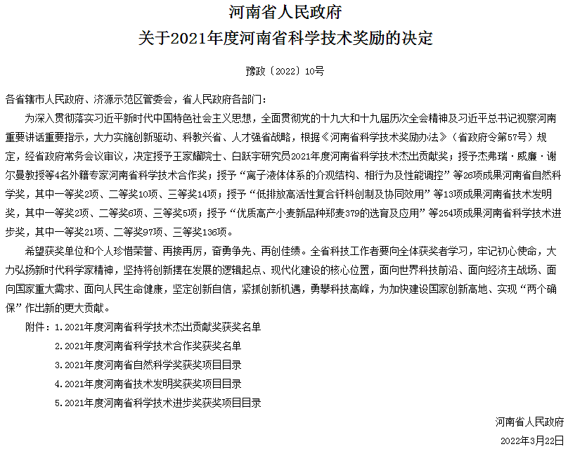 2022年3月31日,河南省人民政府發布了《關于2021年底河南省科學技術獎勵的決定》,為深入貫徹落實習近平新時代中國特色社會主義思想,全面貫徹黨的十九大和十九屆歷次全會精神及習近平總書記視察河南重要講話重要指示,大力實施創新驅動、科教興省、人才強省戰略,根據《河南省科學技術獎勵辦法》(省政府令第57號)規定,召開河南省政府常務會議進行審議