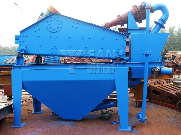 工作原理:將砂水混合物輸送至旋流器,離心分級濃縮的細砂經(jīng)沉砂嘴提供給振動篩,經(jīng)振動篩脫水后,細砂與水有效分離,少量細砂、泥等經(jīng)返料箱再回到清洗槽,清洗槽液面過高時,經(jīng)出料口排出.直線振動篩回收物料重量濃度為70%-85%。調節(jié)細度模數(shù)可通過改變泵轉速、改變砂漿濃度、調節(jié)溢流水量、更換出砂嘴來實現(xiàn)。從而完成清洗、脫水和分級三種功能。